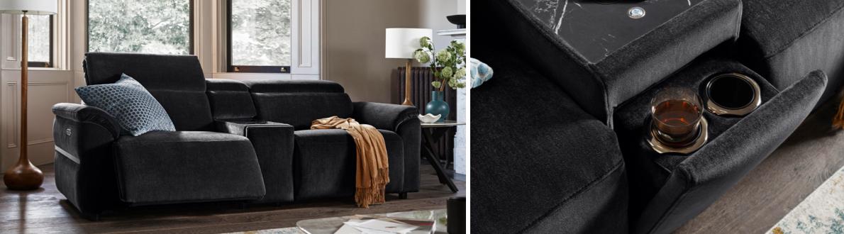 Decidedly out of the ordinary, our contemporary Dolomite collection showcases a dramatic look that’s complemented by distinctive details. A central console is finished with a black marble-patterned stone inlay and features wireless charging and cooling cupholders. The low-profile silhouette presents a striking contrast to the wide padded arms. And the gunmetal-effect trim gives the entire collection a bold, modern look. And comfort’s a given. As well as optional power recliners and perfect-positioning power headrests, these generously proportioned sofas, corner sofas and chairs have sprung seats, sprung backs and pocket spring seat cushioning. Upholstered 100% leather and fabric, the handcrafted Dolomite range is exclusively available at Furniture Village.